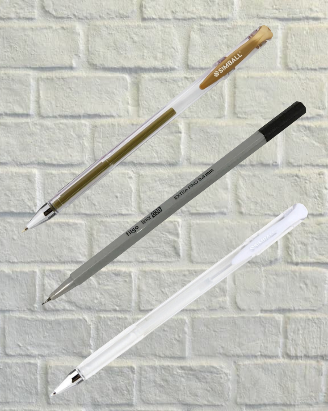 La roller blanca la usan para luces y sombras, nieve. La dorada para destellos, detalles de navidad o luces. La microfibra negra finita para agregar detalles a los dibujos