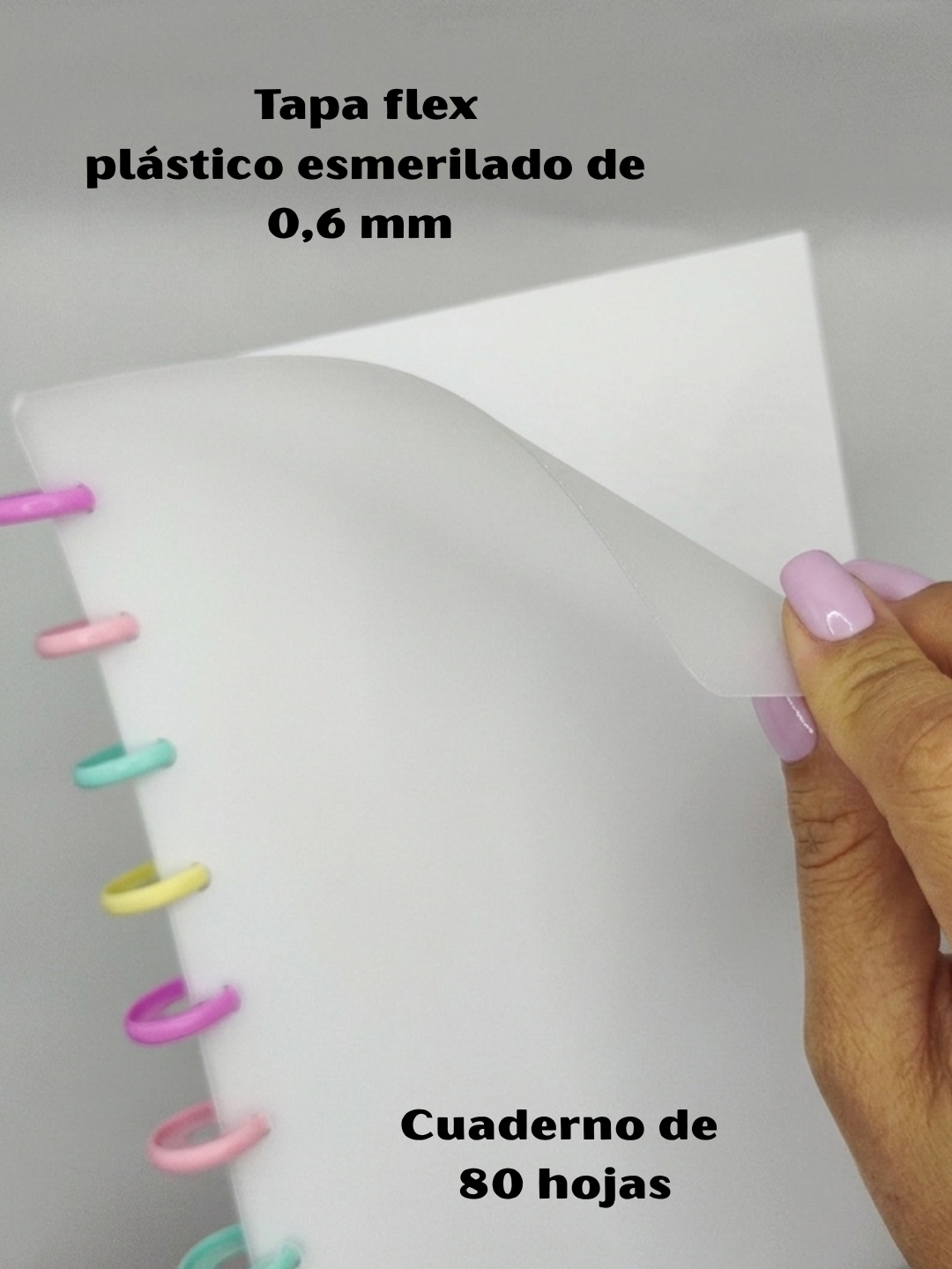 Las tapas del cuaderno son de plástico esmerilado y debajo de éstas, se encuentra el diseño impreso en papel fotográfico de 230 g.