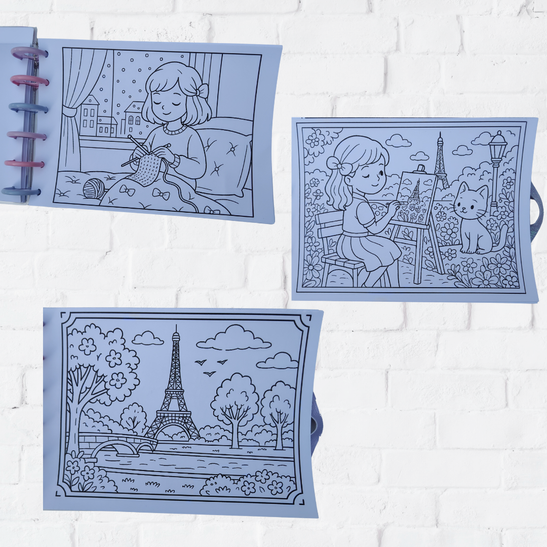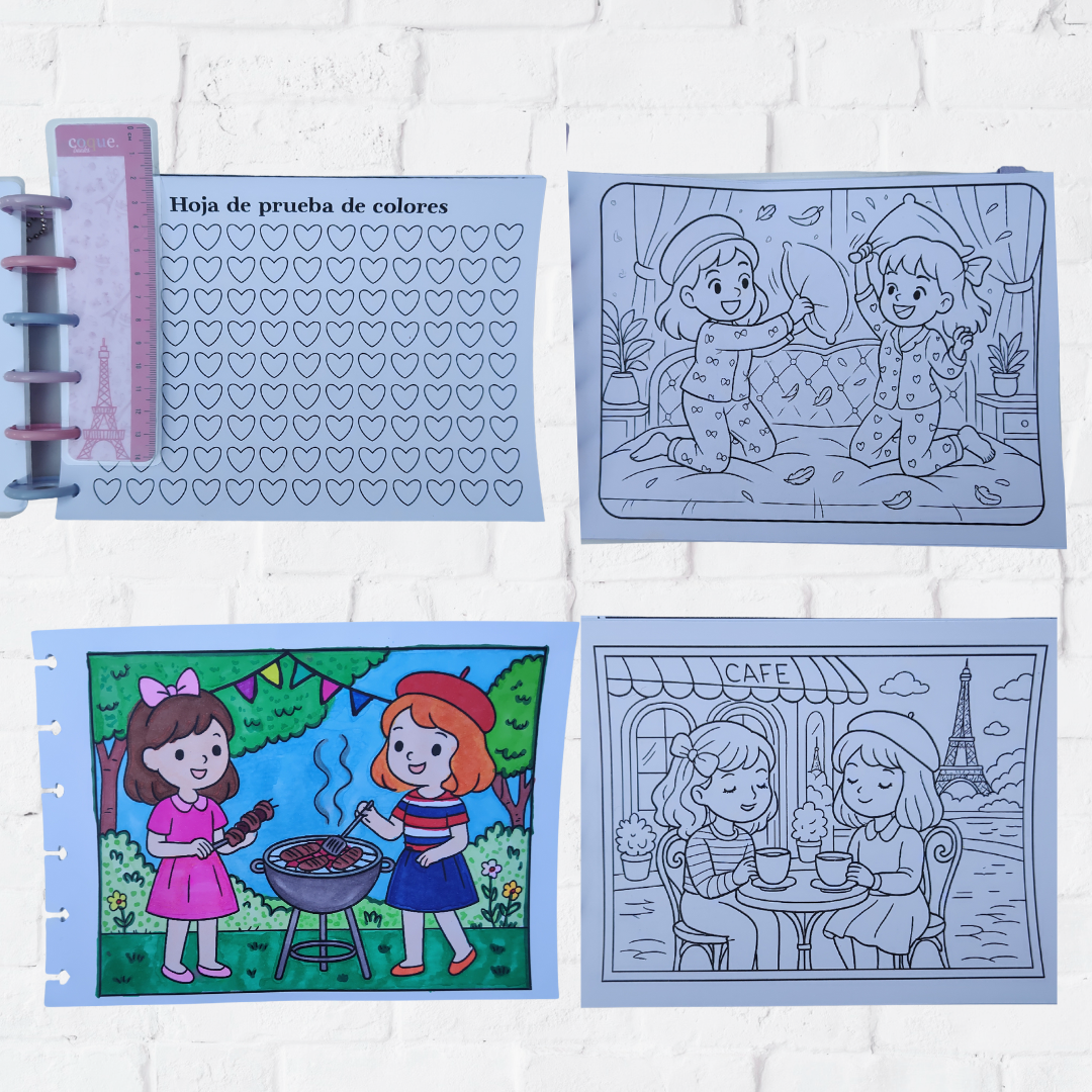 Sistema de discos - hojas removibles (ideal para sacar el dibujo que vayas a pintar, sin manchar la hoja de atrás. Una vez pintado, volvés a colocar el dibujo en su lugar).